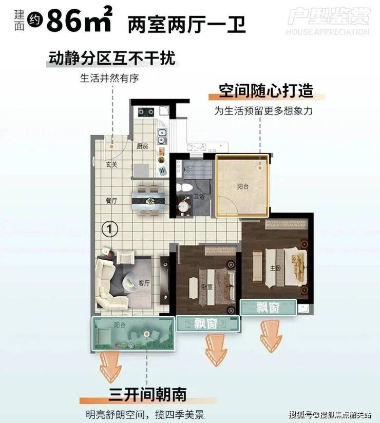 作为项目的主力户型,85-86㎡的两房在空间尺度上有了明显的提升。这款户型最大的亮点在于其纯粹的南向设计。在广州这样一个注重采光的南方城市,南向意味着冬暖夏凉,阳光充足。宽敞的客厅连接着超大阳台,部分房源还可以俯瞰社区内部的园林景观,让居住者在室内就能享受到自然的绿意。厨房采用U型设计,操作台面宽裕,动线流畅;主卧空间阔绰,可容纳大衣柜和梳妆台,提升了居住的尊贵感。这款户型适合对生活品质有一定追求的小家庭,既保证了居住的舒适性,又控制了总价预算,是市场上的“硬通货”。