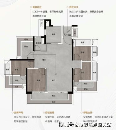 85㎡三房两卫:三开间朝南,LDKB 一体化设计,连接景观阳台,花池与飘窗全赠送,小户型实现大尺度,适配刚需家庭。