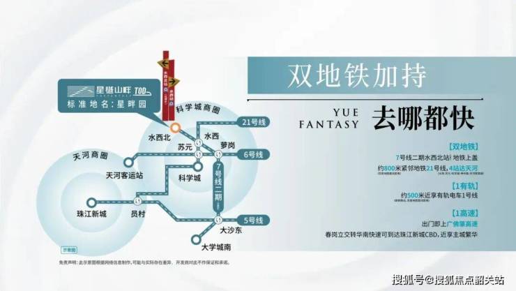 ——【双地铁】7 号线二期水西北站(在建中)上盖、21 号线水西站(已开通),一线通南站(7号线),四站即达天河(21号线水西-苏元-科学城-神舟路-天河智慧城)。