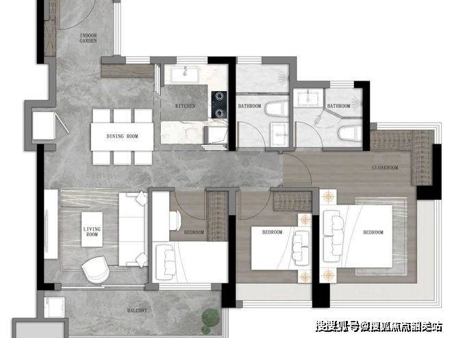 建面约103㎡户型,在入户处新增了一个房间做到四房,布局也变成了横厅布局,南北对流更加通透。