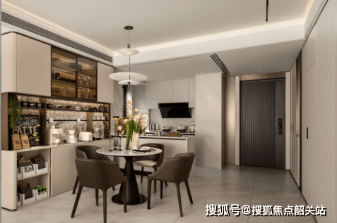 整体空间格局方正通透,全屋采光面开阔,通风对流条件优越,依托极简硬装设计,最大化释放空间尺度,视觉通透感极强。公共活动区域采用开放式布局,客厅、茶室、餐厅、西厨岛台无缝衔接,打破传统居家空间的割裂感,形成阔绰的公共社交场域,既适合家族团聚、全龄同住,也可满足圈层会客、好友小聚的高阶社交需求。设计师深度结合顺德本土茶饮文化,在客厅预留独立开放式茶室空间,作为居家放松、静心品茗、日常休闲的专属角落,将在地生活情怀融入空间设计,让文化扎根日常。