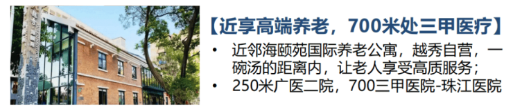 步行约700m可达珠江医院(全国首批三甲)、约250m广医二院(西院区)、南石头社区服务中心;周边约3km内广州红十字会医院、妇幼保健院(二甲)、省口腔医院(三甲)、中山孙逸仙医院南院、广中医骨伤科医院等医疗体系,24H为健康护航。