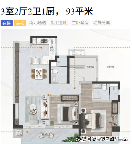 93㎡三房两厅两卫:南北通透,厨卫全明,动静分离,总价110万起。