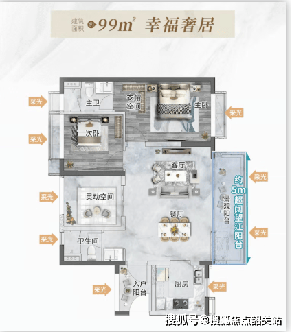 同样采用横厅设计,超5米观景阳台让餐客厅显得格外宽敞明亮。
