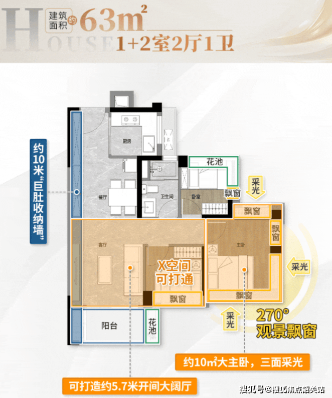 63㎡三房两厅一卫:最高达107%实用率,主卧U型全景飘窗,三开间约9米大采光面。