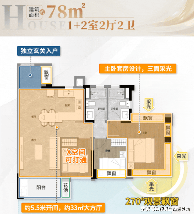 82㎡三房两卫:片区内绝版横厅小户,南北对流,LDKB一体化设计,四开间超11米采光面。