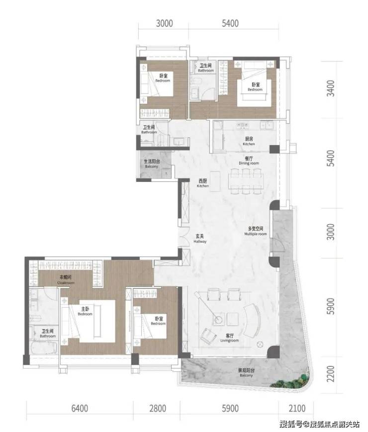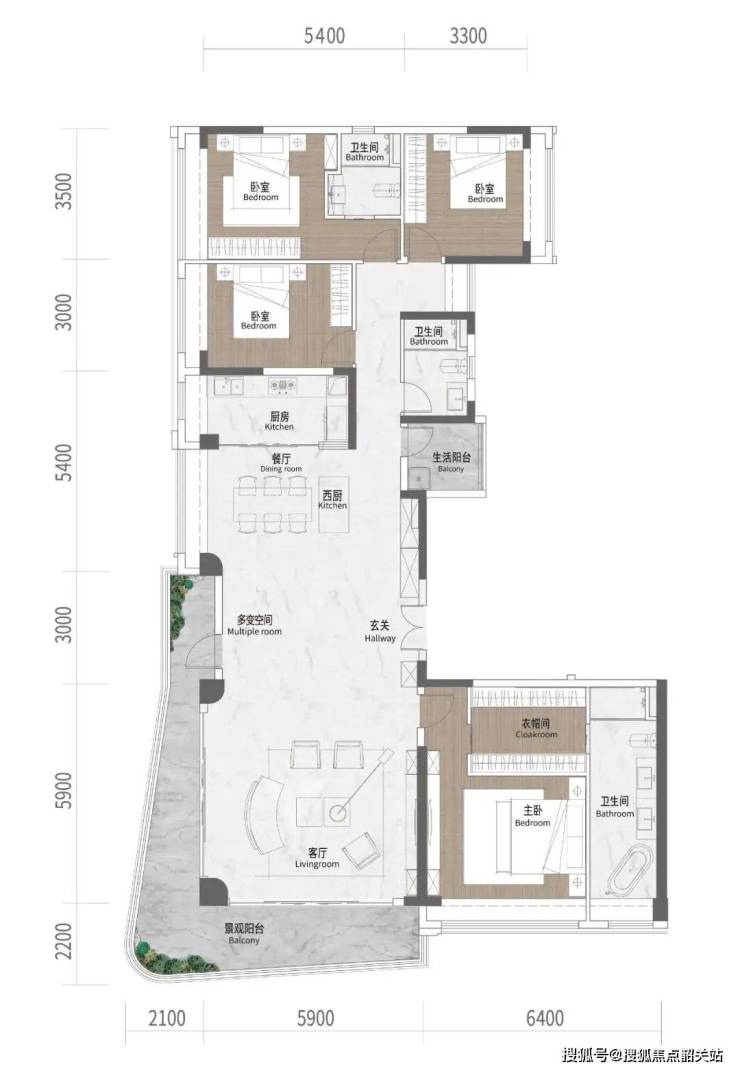 01户型是建筑面积约236㎡的四房两厅三卫、双套房主卧、中西双厨设计、超大方厅,整体空间尺度阔绰。
