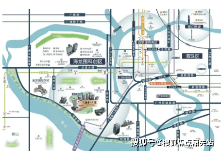 越秀·天瀛坐落于荔湾区海龙科创区,虽然与白鹅潭CBD有一定距离,但依然位于广州市中心区域。项目的北侧紧邻花地河,拥有良好的自然景观资源。