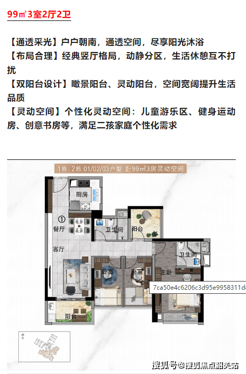 99㎡三房两厅两卫:经典竖厅格局,动静分区明确,配备双阳台(瞰景阳台 + 灵动阳台),主卧带独立卫浴与飘窗,实测主卧面积超 16㎡,两个次卧最小面积达 9㎡,预留个性化灵动空间(可改造为儿童游乐区、健身区或书房),满足二孩家庭居住需求。
