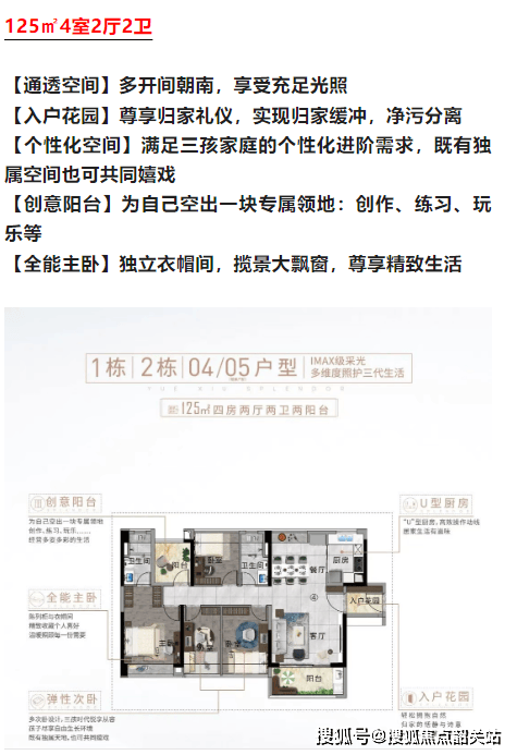 125㎡四房两厅两卫:多开间朝南设计,入户花园实现 “归家缓冲 + 净污分离”,客厅开间达 4.2 米,连接约 6 米景观阳台,主卧套间配备独立衣帽间与揽景飘窗,实测主卧面积超 20㎡,拓展空间可满足三孩家庭个性化需求,同时创意阳台可作为专属兴趣空间(创作、练习或玩乐),兼顾家庭互动与私人静谧。