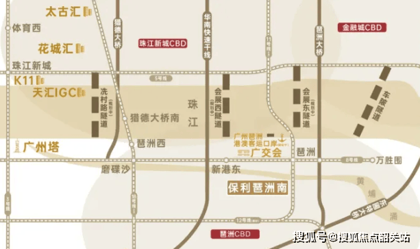 项目位于琶洲南TOD东侧,步行距离广州地铁8号线和11号线琶洲站仅900米。此外,保利天奕还通过自建及联动方式,形成三级交通网络,便于居民出行。
