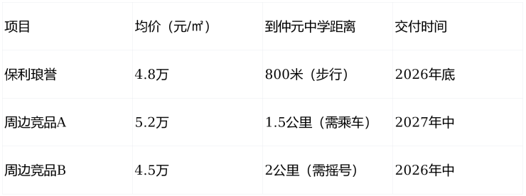 💡 我的建议:保利琅誉虽单价略高,但确定性更强(学区、交付时间、品牌),综合成本反而更低。