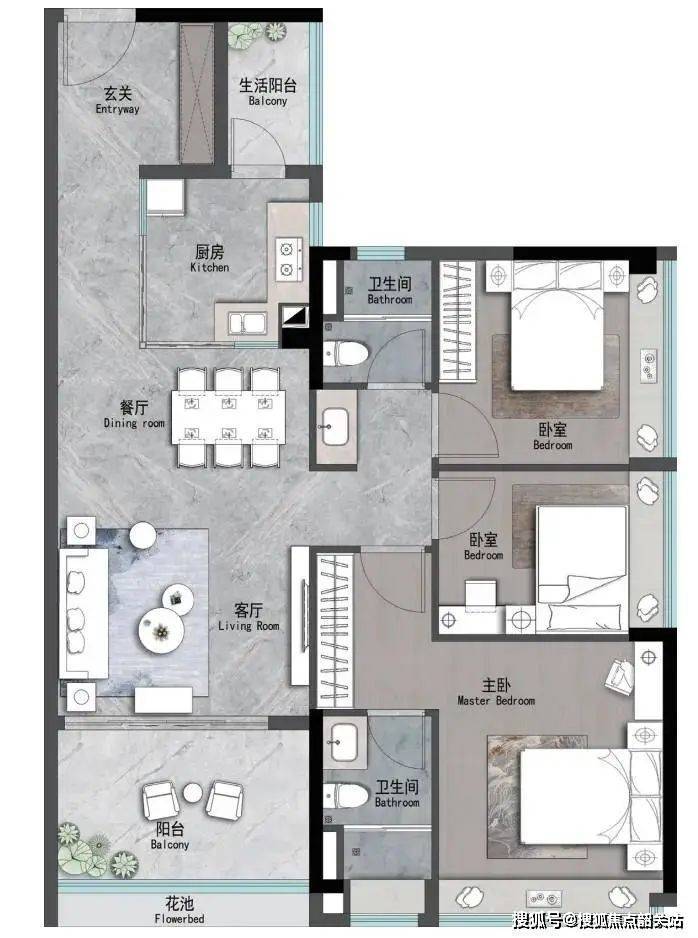 建面约93平方米:3室2厅2卫,适合小家庭居住。