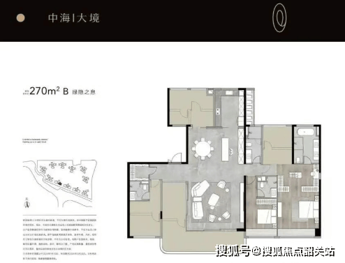 270平方米五房三卫:南向面宽达16米,搭配10米L型转角阳台,享有双重景观视野。