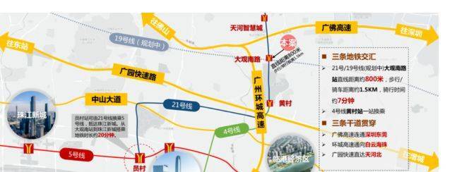 地铁网络:项目周边三地铁环绕,距离 4 号线黄村站以及 21 号线大观南路站仅 800 米,且未来还有 19 号线加持。从大观南路地铁站出发,7 站即可到达珠江新城,3 站到员村,4 站到珠江新城,便捷的地铁交通极大缩短了与城市核心区域的时空距离。售楼处电话:4009909752 。