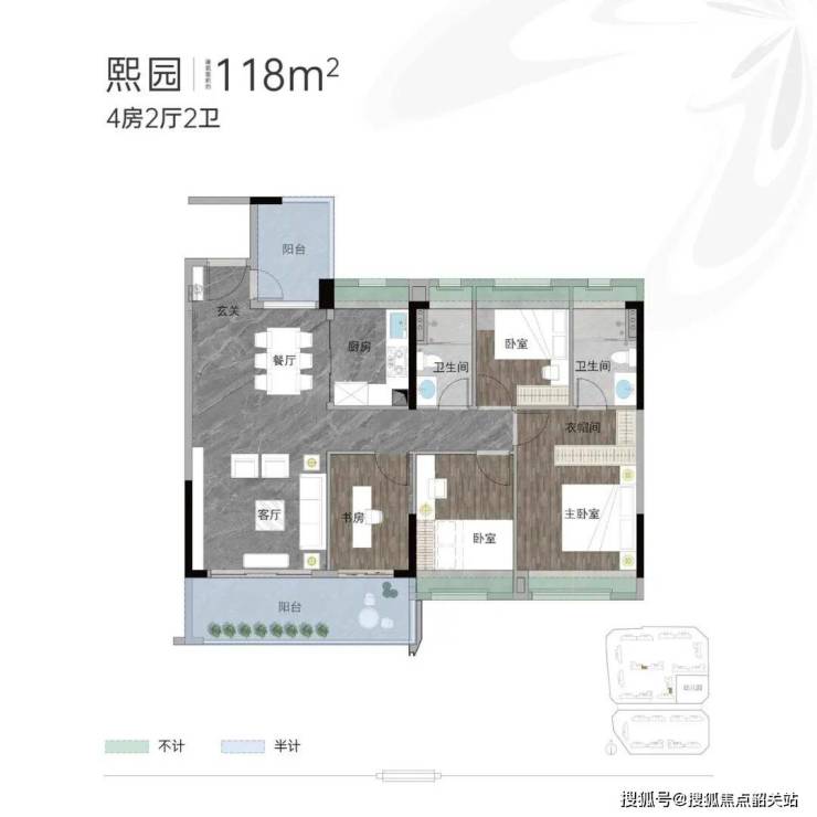 建面约118㎡四房:南北通透+双阳台,主卧套房设计,得房率92%,总价330万起;