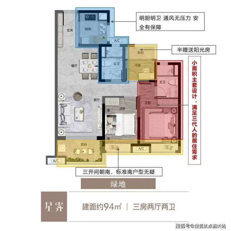 92㎡三房二厅二卫:全南采光,卧室全飘窗,性价比高。