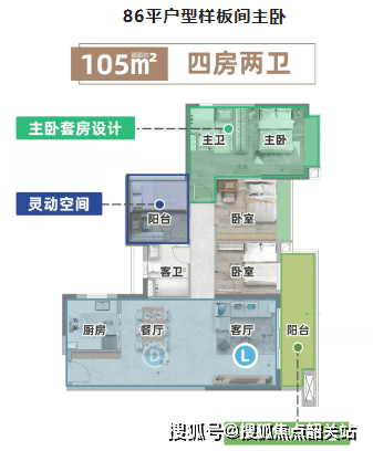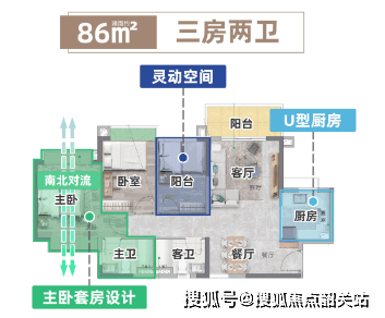 首铸•铂瑞云湾项目在户型设计上充分考虑了不同家庭结构与生活需求的多样性,推出86至152平方米的全龄段奢适多功能N+1房,涵盖三房至四房多种户型组合,满足刚需、改善、终极置业等各类客户需求。其中,约86平方米产品实现惊人的三房两卫格局,得房率超九成,空间利用率极高。该户型动静分区明确,玄关、客厅、餐厅、厨房、卧室、卫生间等功能区划分清晰,动线合理,互不干扰。全屋均采用飘窗设计,采光充沛,南北通透,空气流通性好。U型厨房洗切煮动线流畅,干湿分离的双卫设计保持干爽整洁,主卧套房设计确保业主隐私,南北双飘窗设计让清风穿堂而过,四季如春。