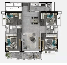 约131平方米户型面向小区,为南向双阳台设计,大阳台连接客厅与主卧,采光和景观视野俱佳,可直接俯瞰2300平方米的泳池与儿童休闲空间,享受度假般的居住体验。该户型同样具备南北通透、动静分离、多面采光等优势,空间尺度阔绰,功能分区合理,适合三代同堂或二胎家庭居住。约152平方米户型则为终极改善之选,四房四卫设计,主卧带独立衣帽间与浴缸,次卧均可做书房或儿童房,客厅开间达6米以上,连接超大阳台,可打造空中花园,满足全家人的社交与休闲需求。