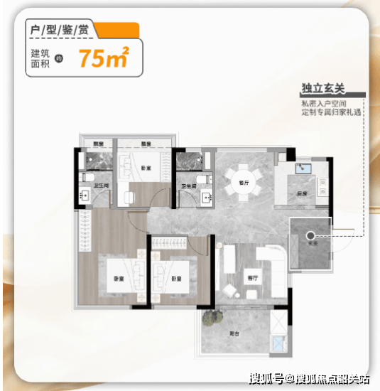 75㎡户型为超新规设计,使用率达 120%,实际使用面积约 90㎡,通过合理布局,做到三房两厅两卫,独立玄关、U 型厨房、主卧套间功能齐全,客厅与卧室空间紧凑但不拥挤,适合三口之家或刚需上车人群。建议到样板间实地体验空间尺度,感受实际居住舒适度。