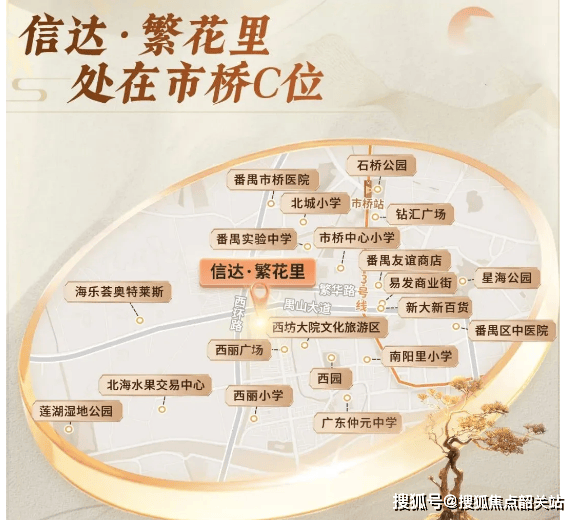 信达・繁花里位于番禺市桥禺山大道南侧,地处老城核心区域,生活氛围浓厚。交通方面,步行约 1.7 公里到 3 号线市桥站,1 站可达长隆 / 番禺广场,换乘 7 号线 2 站到万博、3 站到海珠、8 站到珠江新城,同时可接驳 18/22 号线;规划中的 26 号线(有望在禺山大道设站)未来或成地铁上盖,交通便利性将进一步升级;自驾临近禺山大道、西环路,接驳东新高速、新光快速,快速通达荔湾、海珠、珠江新城等核心区域。周边配套成熟,3 公里内有市桥城芯商圈(易发商业街、钻汇广场)、市桥南商圈(奥园广场)、番禺广场商圈(永旺梦乐城),医疗方面有番禺中心医院、何贤纪念医院(甲级),日常购物、就医便捷。
