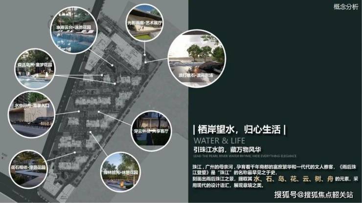 豪宅园林缔造者上海朗道景观规划设计有限公司,从刻画雨后珠江之景的《雨后珠江登望》中提取水、石、鸟、花、云、树、舟的自然元素,以现代的设计展现自然景观的惬意意境之美,为高净值人群的生活体验和使用需求提供顶级生活范本。