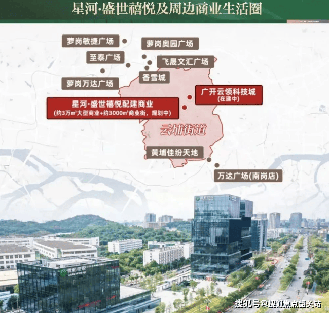 项目所在区域是广州科学城的核心地带,汇聚了众多高科技企业和高素质人才。周边商业配套丰富,沿着开创大道分布着多个高端购物中心,如萝岗万达广场、星际云汇、香雪城(在建)等,总面积达300万平方米。此外,项目自身还规划有约3.3万平方米的大型商业综合体和3000平方米的商业街,为居民提供了丰富的购物娱乐选择。