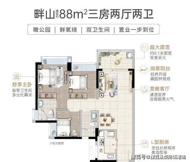 92㎡三房:L型厨房设计,主卧带飘窗,山景/园景随心切换;
