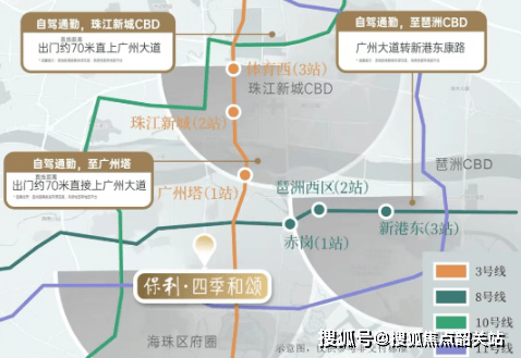 保利四季和颂周边有四条地铁线路(3/8/10/11号线)交汇,尽管最近的地铁站距离小区约为1.5-1.8公里,但通过广州大道南可以快速抵达珠江新城、琶洲等重要商业区域,自驾出行非常便利。