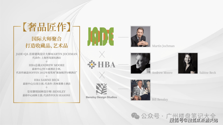 全球顶级建筑设计机构:JADE&QA(上海世茂深坑酒店、迪拜的 Jumeira Beach Hotel) 全球顶级室内设计机构:HBA设计(苏州莱佛士酒店、成都费尔蒙酒店、河内洲际酒店、印尼洲际酒店等超是个五星级酒店设计)