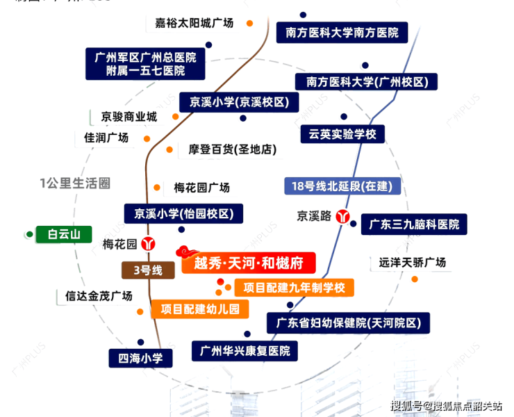 项目地处广州城市中轴线上,距离珠江新城直线距离仅5公里,紧邻地铁3号线梅花园站,步行约800米即可到达。未来,随着地铁18号线北延段京溪路站的开通,将进一步提升项目的出行便利性。此外,周边还有广州大道北、沈海高速等多条主干道可供自驾出行,前往金融中心的行程基本可以在30分钟内完成。