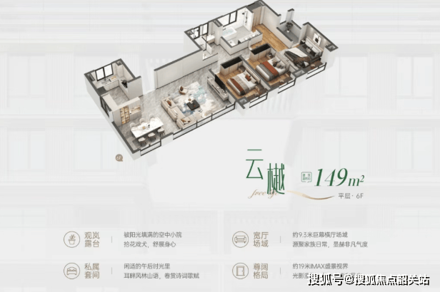 顶层平层(149㎡):赠送约30平方米的超大露台,可作为空中花园、BBQ区或茶室,享受私密的天空之境。