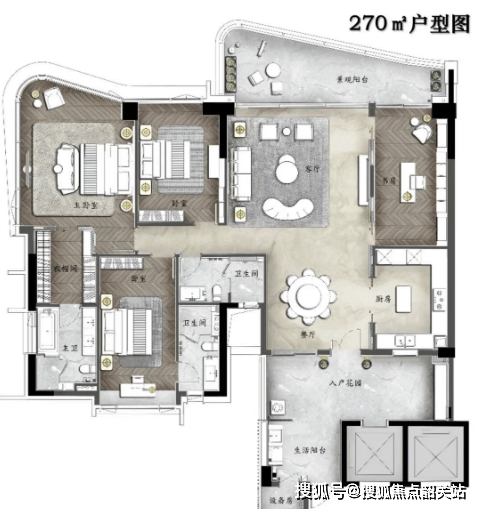 A户型:270㎡环幕江景四房,拥有约9米超大邮轮式阳台。