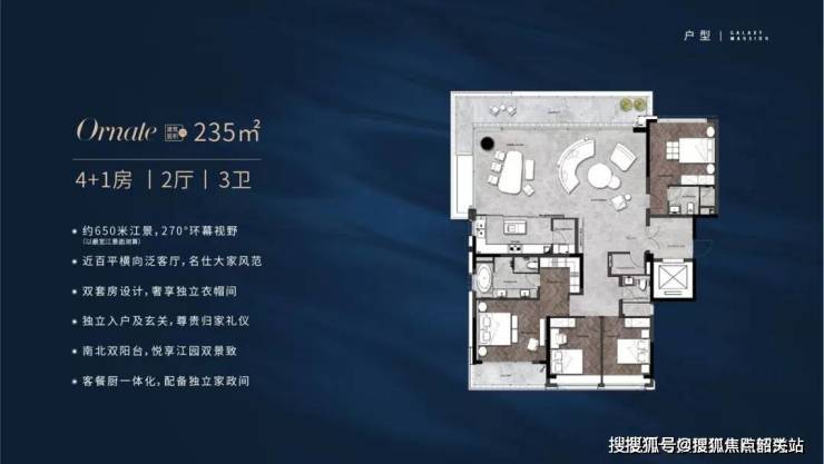 项目主推179㎡四房、235㎡五房户型,均采用“南北通透+双主套+超大阳台”设计。以235㎡户型为例: