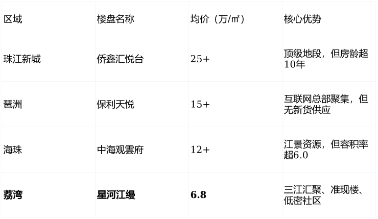 对比天河、海珠江景房:天河珠江新城江景房均价已突破15万/㎡,海珠琶洲江景房均价12万/㎡,而荔湾·星河江缦均价仅6.8万/㎡,性价比优势显著。