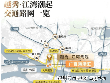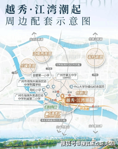越秀江湾潮起坐落于海珠区大干围板块,地处珠江后航道黄金岸线,是板块内首个亲江新规项目,地段稀缺性显著。从区域发展看,项目依托海珠后航道规划红利,未来将成为集滨江生态、高端商业、优质教育于一体的宜居板块;同时紧邻海珠湾隧道(在建,今年开通后 15 分钟可达广州南站)与环岛路(石岗路 - 大干围路段,今年开通临时道路),交通路网持续升级,区域价值潜力可观。