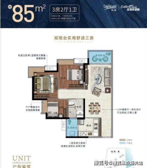 85㎡三房:三开间布局,主卧朝南,阳台可观园景或海景,适合年轻家庭;