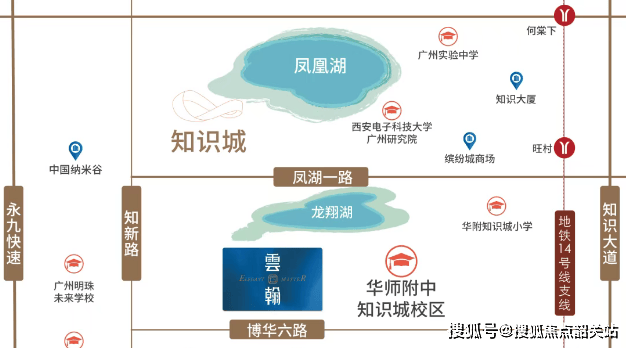 项目距离地铁14号线汤村站约2公里,日常出行更依赖自驾或短途接驳工具。对于习惯地铁通勤的人来说,这个距离确实不算近。但换个角度看,项目所处的知识城南起步区,本身就是一个产业密集、职住平衡度较高的区域。不少业主就在周边的小鹏汽车、中新国际智慧产业园上班,早高峰开车到单位可能比等地铁还快。而且从小区出发,通过创新大道或正在建设的永九快速路,能较快接入科学城乃至天河核心区。如果需要跨城出行,花莞高速知识城出口就在附近,连通广河、华南快速等主干道,整体路网支撑力其实不错。