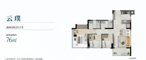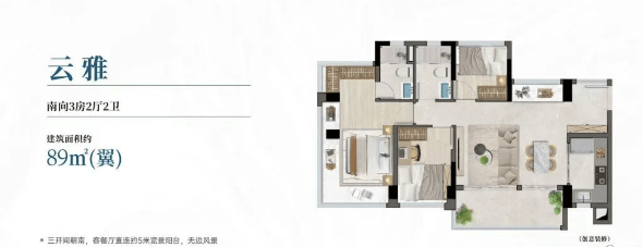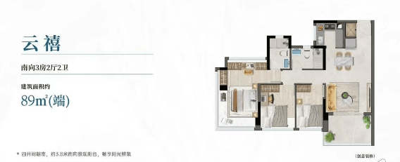 主力户型集中在76至142平方米之间,全部为全南向设计,实用率普遍超过100%,最高可达约115%。我重点看了建面约89㎡的三房样板间:进门是玄关收纳区,紧接着LDK(客厅、餐厅、厨房)一体化布局,南向阳台贯通客厅与次卧,形成双面采光。主卧带飘窗,次卧和书房也都能开窗见绿。更巧妙的是,开发商利用新规政策,在阳台、飘窗等部位做了合理拓展,让实际使用面积比产权面积多出十几平。这种“高得房率”在当下市场并不多见,尤其对预算有限但又希望功能齐全的年轻家庭来说,算是一大实打实的利好。