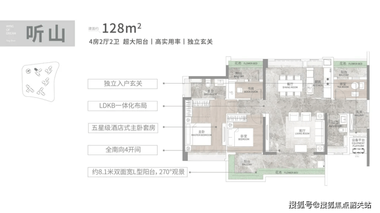 建面128㎡四房户型,亮点在于L型独立玄关与8米L型阳台设计。L型玄关有效划分入户空间,保障室内私密性,同时提供充足的收纳空间,让入户整洁有序;8米L型阳台横跨客厅与卧室,既拓展了景观视野,又增加了实用空间,可作为休闲区、花艺区或晾晒区,满足多元需求。