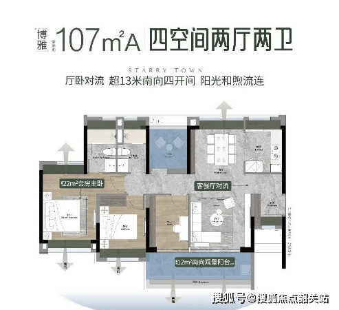 107㎡A四空间两厅两卫:配置南向观景玄关,4.5开间朝南,客厅主卧双南北对流,畅享双面宽观景阳台。