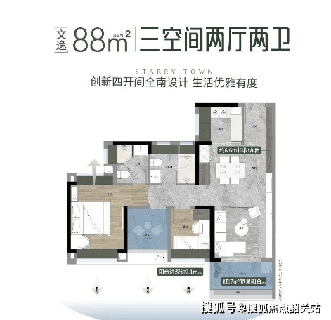 88㎡三空间两厅两卫:四面宽小户型设计,朝南居家生活,三卧室朝南,超11米景观线,享受充足的阳光。