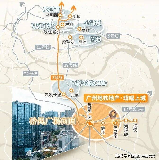 珑曜上城周边生活设施齐全,距离项目2站的番禺广场是番禺区的行政、交通、教育、医疗、文化中心。这里既有“花城广场”、“两馆一中心”等高能级配套设施,也有永旺梦乐城与基盛万科里等商业综合体,提供了丰富的生活选择。同时,项目西侧的金龙城财富广场也引进了麦当劳等知名品牌,进一步丰富了周边的商业生态。