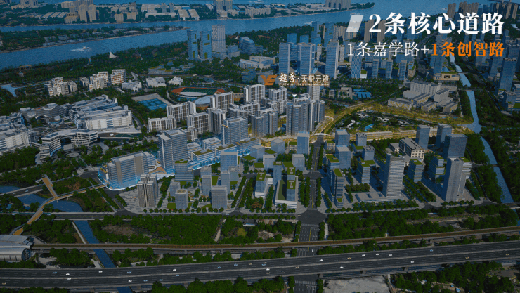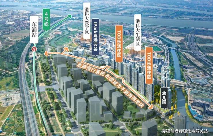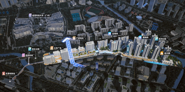 - **超级连廊**:越秀地产打造的超级连廊参考纽约高线公园、香港人行天桥,采用架空设计。不仅遮雨遮阳,保障安全出行,还直接连接居住地块、产研地块、香港科技大学(广州)、河涌公园、街心公园、东涌地铁站等丰富配套。业主可通过连廊便捷到达各个区域,形成无边界的“环港科大”生活圈,无惧风雨,步行可达。