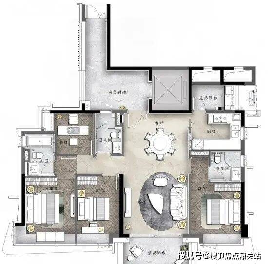 C户型:约140㎡南向园景大宅,超高性价比,三卧室朝南设计,阔绰双主套房。