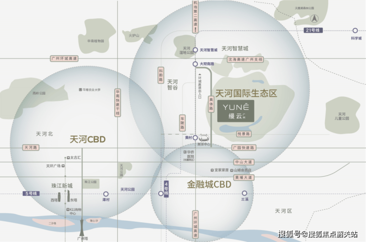 缦云广州择址天河国际生态区核心,与两大经济引擎天河CBD和金融城CBD,保持约6公里的直线距离。