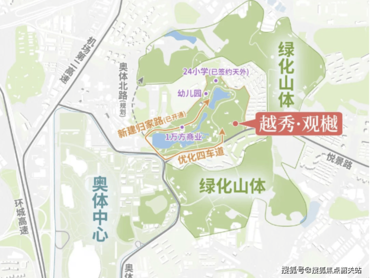 项目位于天河区世界大观板块,地理位置优越,环绕着自然山体和水系,环境宜居。交通方面,虽然目前距离最近的地铁站约两公里,但该区域通过悦景路与珠吉路、奥体路等多条主干道相连,车行通达性良好。悦景路正在实施四车道拓宽工程,预计2025年完工,将大幅提升交通流畅度。此外,未来规划中还将新建连接奥体路与机场高速的道路,进一步完善区域交通网络。该区域交通虽目前存在一定短板,但随着规划推进,出行便利性有望显著提升。毗邻区域的快速路和高速公路入口也为私家车通勤提供便捷条件,适合对交通要求灵活多样的改善型客户。