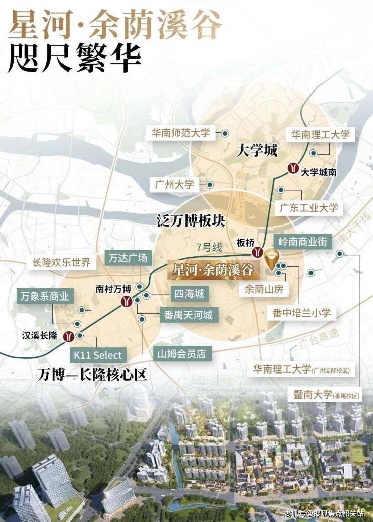 交通方面,星河·余荫溪谷占据了得天独厚的地理位置。项目距离地铁7号线板桥站仅约500米,步行几分钟即可到达。7号线作为广州的一条重要交通动脉,连接了大学城、万博CBD、琶洲会展中心、珠江新城等多个核心板块。从业主家门口出发,2站即可到达万博,1站直达大学城,5站抵达琶洲,6站直通珠江新城。无论是上班通勤,还是商务出行,都极其便利。此外,7号线还直达广州南站,对于经常需要乘坐高铁出差的业主来说,更是一个巨大的利好。自驾方面,项目周边路网发达,南大干线、广台高速、京珠高速、南沙港快速、番禺大道北、华南快速等主干道纵横交错,贯穿广州全城。无论去往城市的哪个角落,都能快速通达,畅行无阻。
