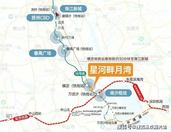 星河畔月湾地处明珠湾区核心,精准卡位国际金融岛与南沙枢纽TOD两大战略引擎之间。项目虽距离地铁18号线横沥站有一定距离,但首批交楼后将开通免费业主楼巴接驳,有效提升通勤便利性。18号线作为“中国最快地铁”,设计时速160公里,4站直达天河冼村,3站抵达珠江新城,高效串联广州核心商务区;南延段未来还将通达中山、珠海,进一步拓展生活半径。项目距南沙枢纽站仅约5公里,该枢纽规划为14站、30线轨道高铁超级站点,深江高铁建成后将实现湾区“一小时生活圈”。自驾方面,门前灵新大道作为继凤凰大道后的南沙第二条城市主轴,连接区域各大板块,深中通道广州出入口亦近在咫尺,交通网络辐射能力极强。