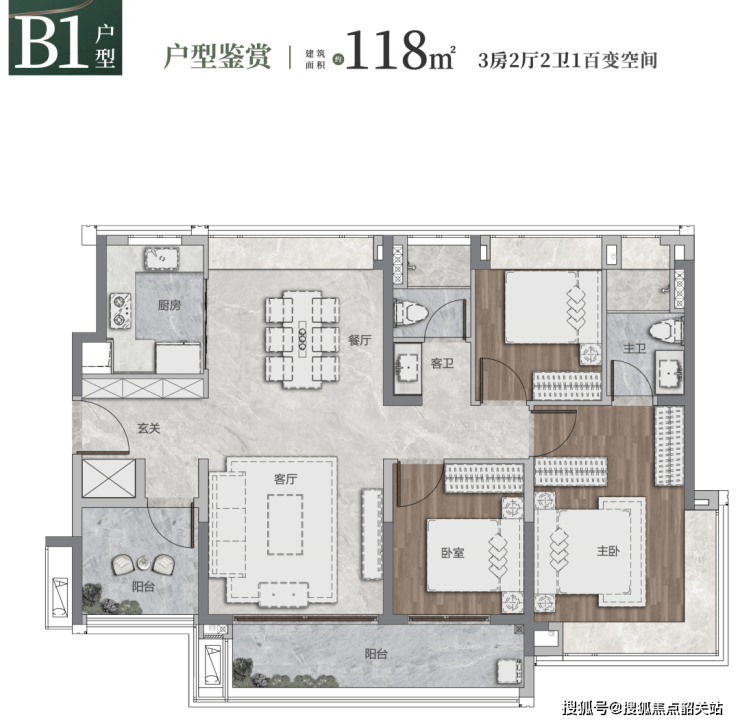 118㎡三室两厅两卫:提供更宽敞的生活空间,适合追求更高品质生活的家庭。